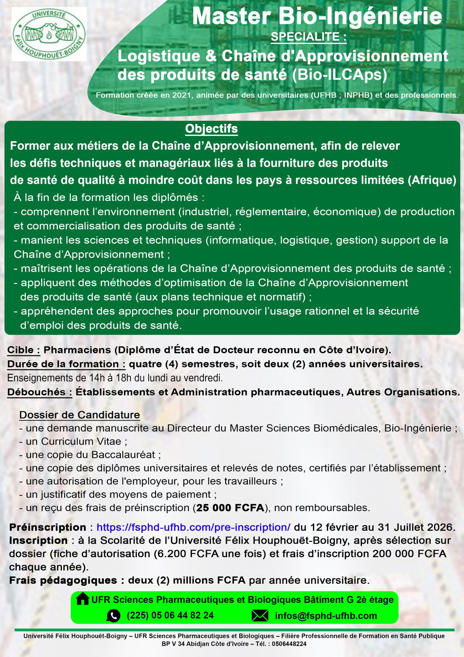 Renseigner la rubrique pré-inscription sur le site. remplir et à imprimer formulaire physique à partir de votre mail Puis ajouter votre curriculum vitae et le diplôme avec lequel vous postulez en ligne Prévoir la somme de 25 000 f cfa …
