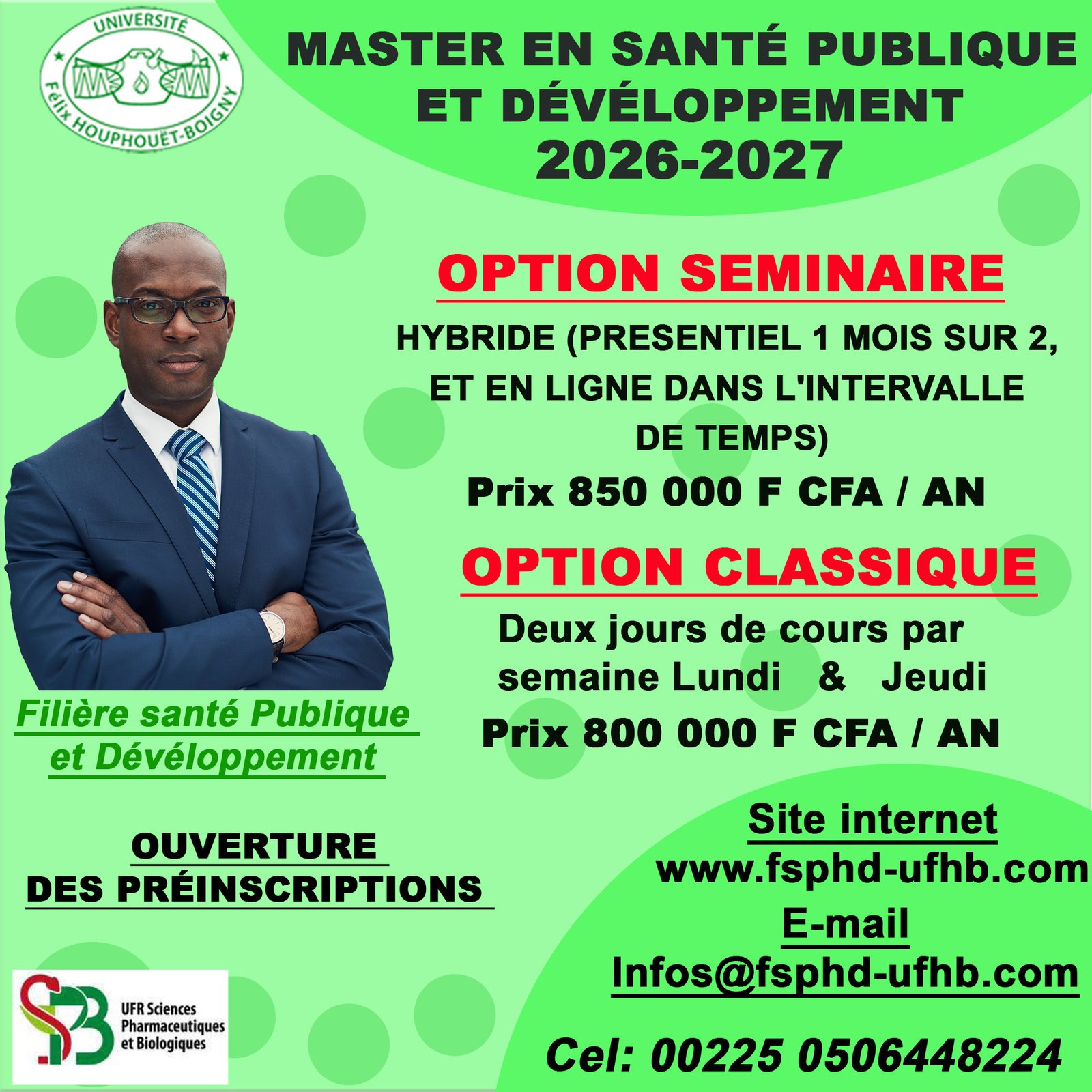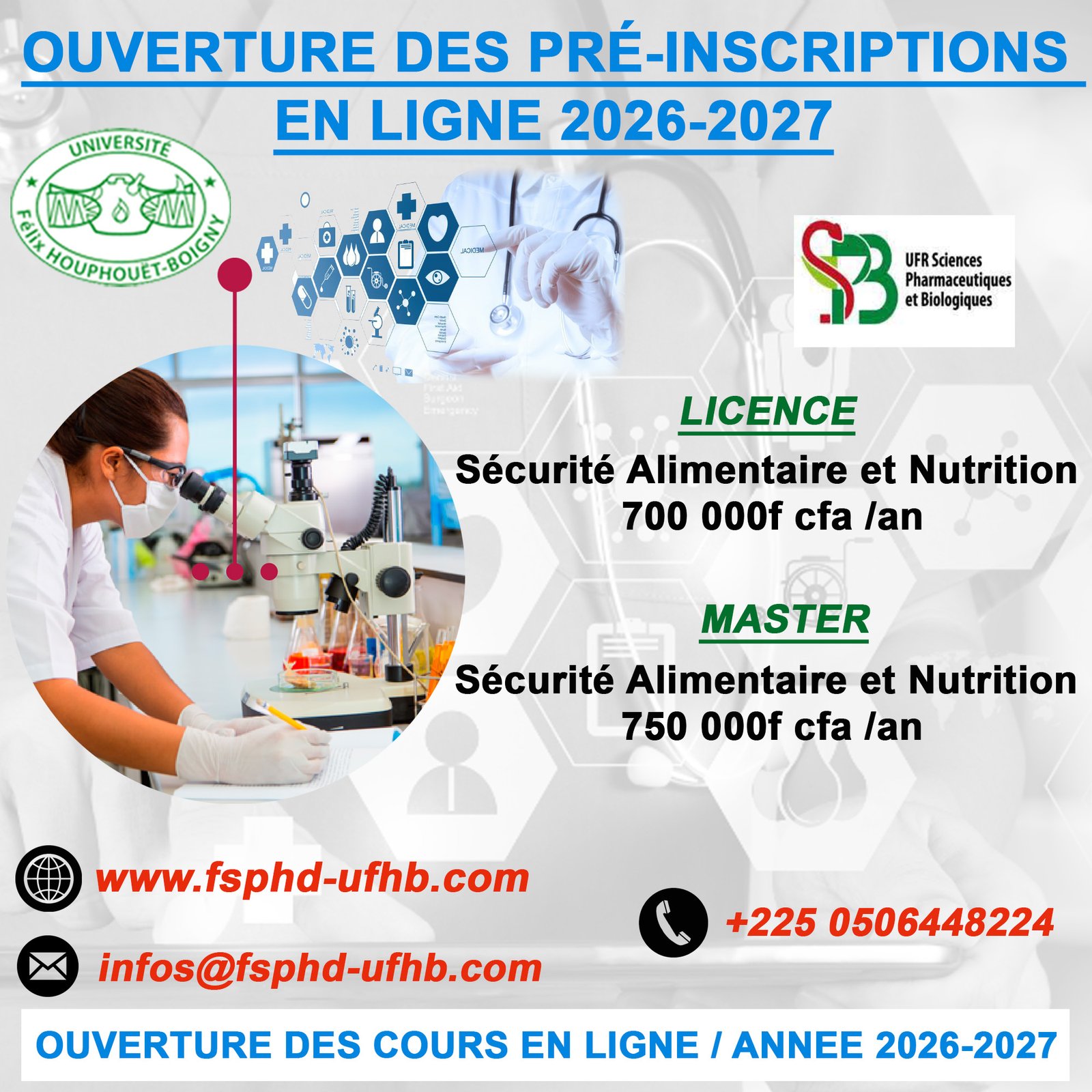Cette réunion est réservée aux inscrits en Licence et Master en Sécurité Alimentaire et Nutrition ou en Hygiène et Sécurité Hospitalière. le Mercredi 20 Décembre 2023 à 9H, au Bâtiment C 1er étage (salle A) de l’UFR SPB.